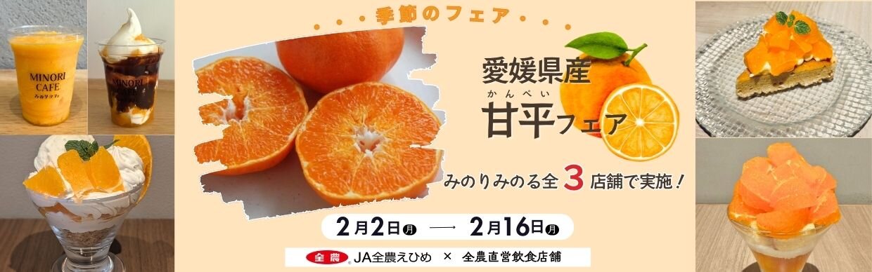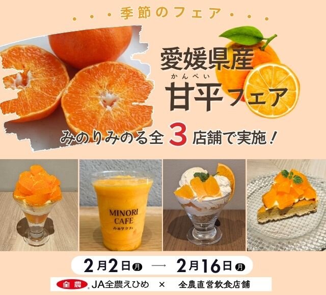 - 2026.01.30 フェア・イベント元気市広島岡山店 ~ぷちっと弾ける食感と甘い果肉が詰まった高級柑橘~ 全農直営飲食店舗で「愛媛県産甘平フェア」を 2月2日(月)~2月16日(月)に開催