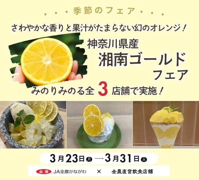 - 2026.03.17 ~爽やかな香りと果汁がたまらない幻の柑橘~ 全農直営飲食店舗で「湘南ゴールドフェア」を 3月23日(月)~3月31日(火)に開催