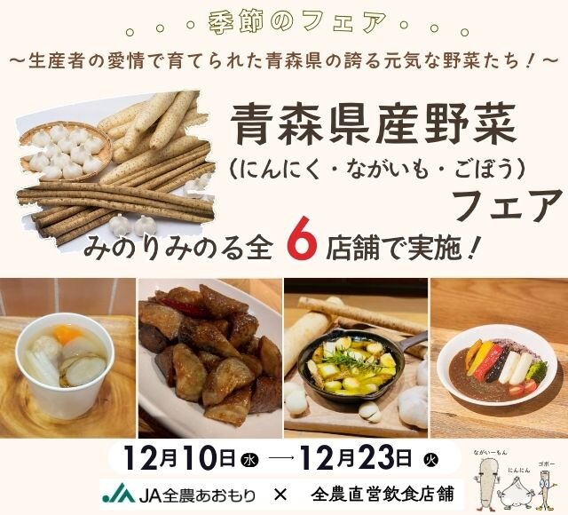 - 2025.12.08 フェア・イベント ~生産者の愛情で育てられた青森県の誇る元気な野菜たち!~ 全農直営飲食店舗で「青森県産野菜フェア」を 12月10日(水)~12月23日(火)に開催
