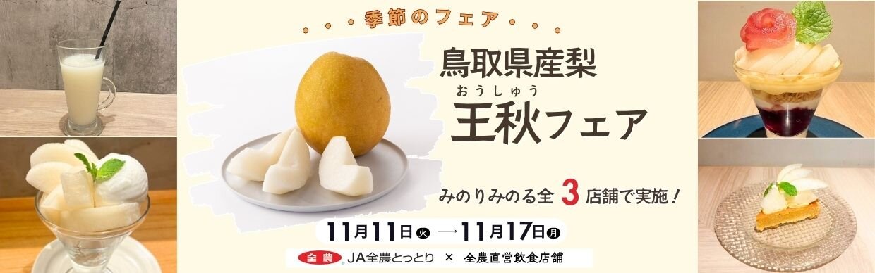 - 2025.11.04 フェア・イベント博多店岡山店 ~ジュワっと口に広がる果汁と上品な甘み~ 鳥取県産梨「王秋(おうしゅう)フェア」を 直営飲食店舗で11月11日(火)~11月17日(月)に開催