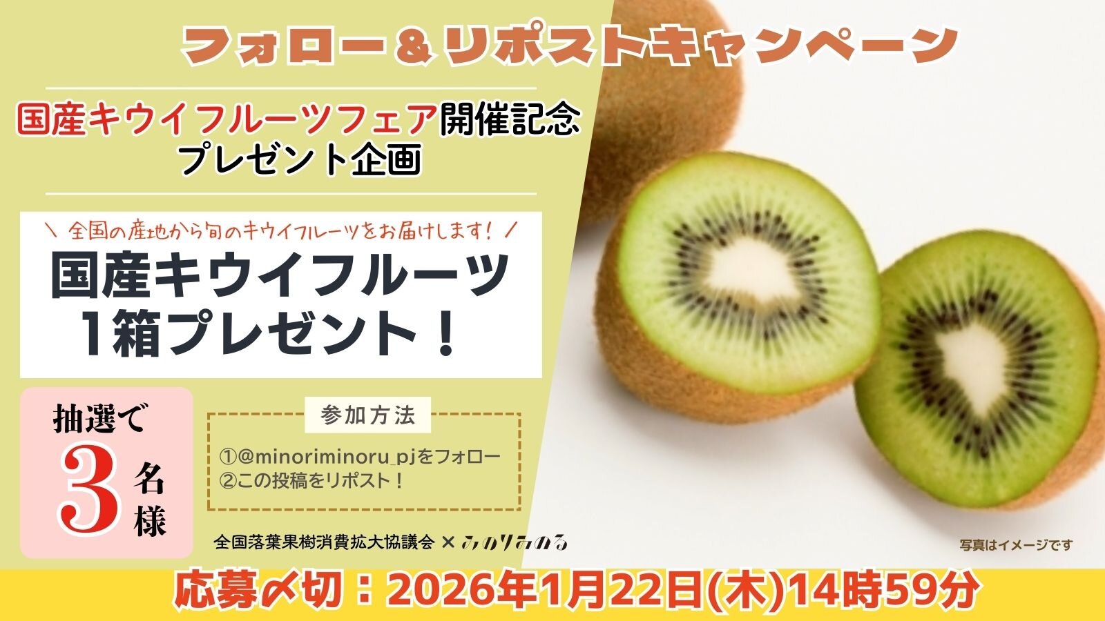・商品内容:「国産キウイフルーツ(1箱)」3名様にプレゼント