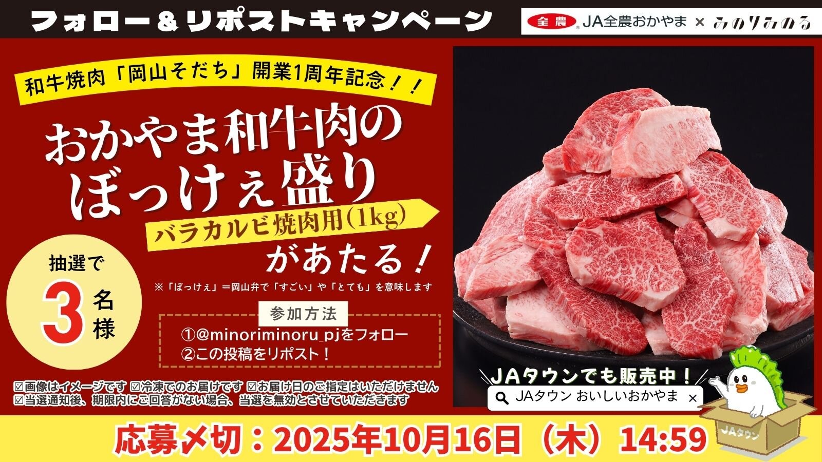 「おかやま和牛肉のぼっけぇ盛り バラカルビ焼肉用」1kgを3名様にプレゼント